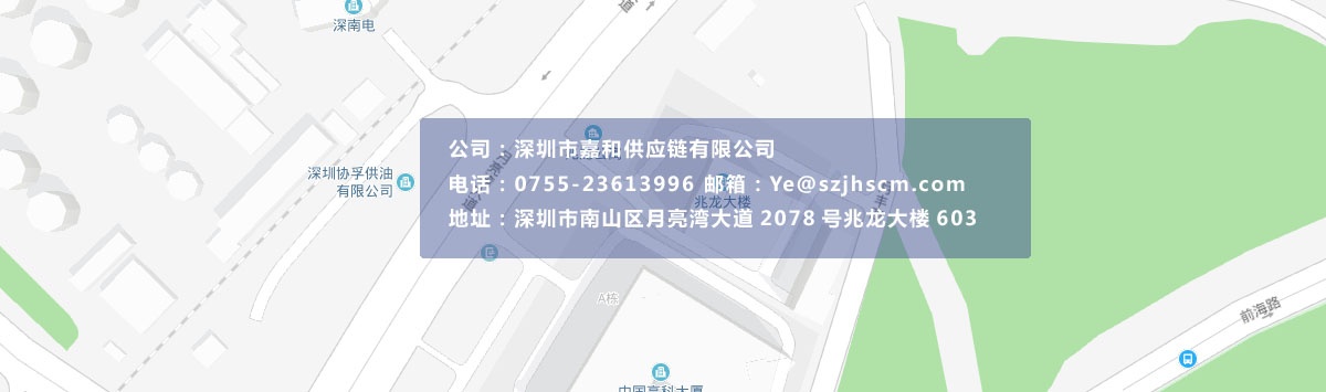 深圳市嘉和供应链有限公司地 址:深圳市南山区月亮湾大道2078号兆龙大楼603电 话:0755-23613996 传 真:0755-23613996 邮 件:ye@szjhscm.com |